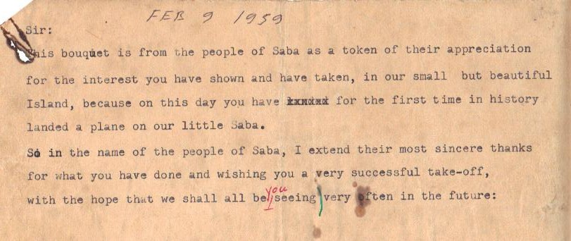 The historic day was February 9th, 1959 and practically the whole of Saba was gathered at Flat Point to experience what they hoped would be the first plane landing on our island. We were in the Boys town in Brakkeput on Curacao and had not heard anything about all that was taking place on Saba. Matthew Levenston’s son Harold was with us and out of the blue he got a telegram which read:”Plane landed safe. Pilot O.K.” and that was it. It took another week before our mail reached and our families back on Saba let us know what had taken place.