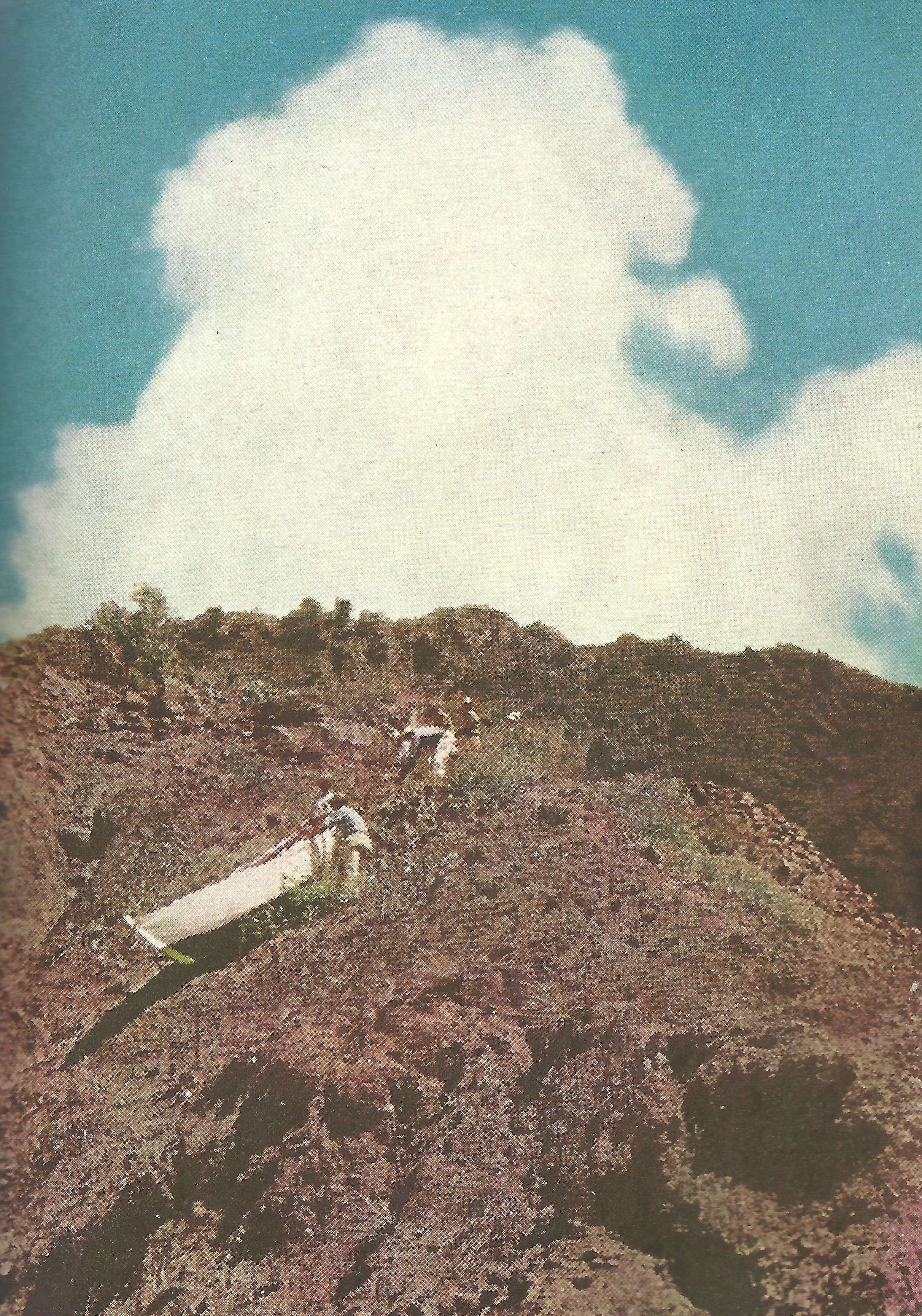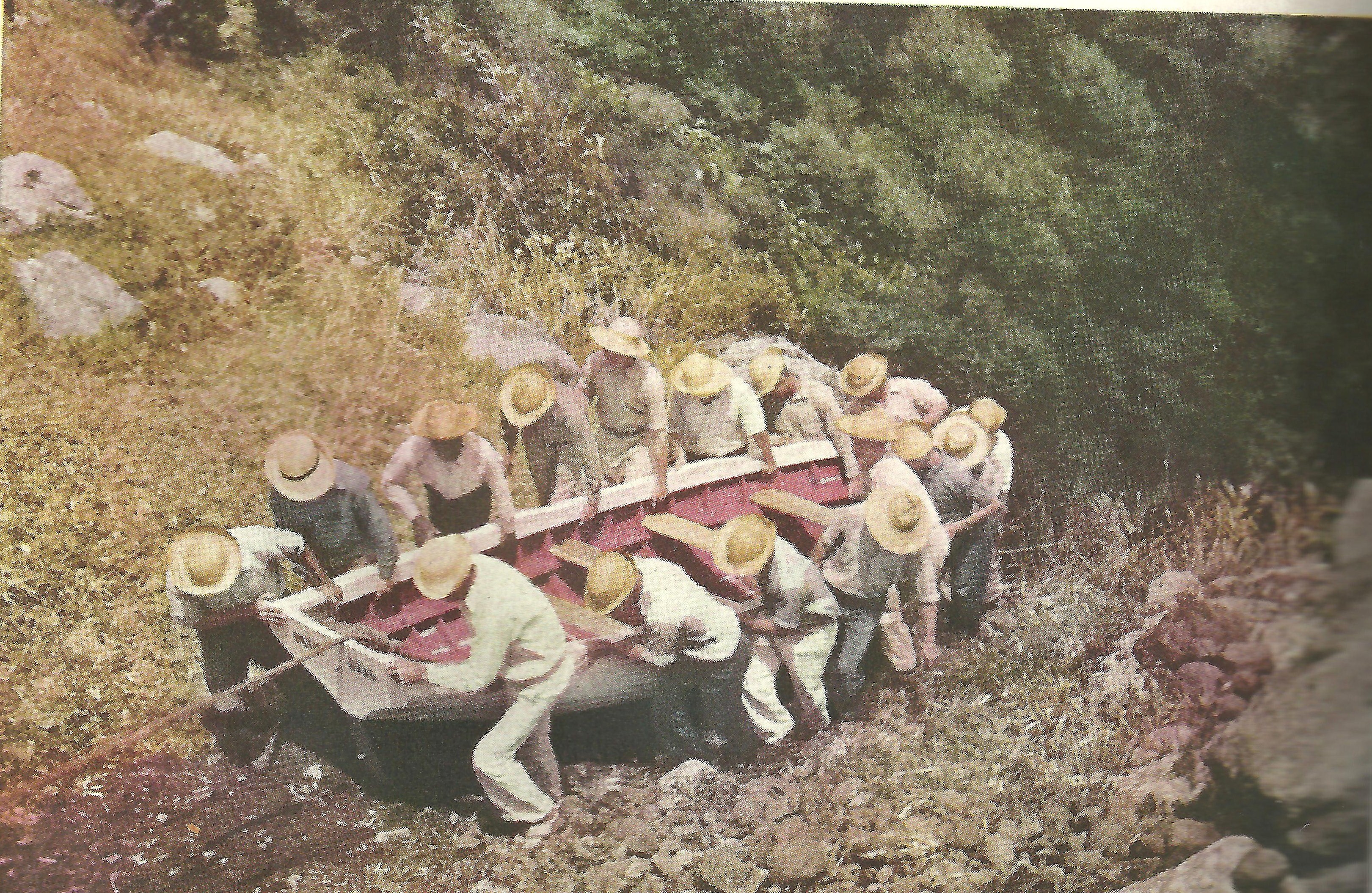 launching. The boat was built by a Johnson. He was just painting “Blue Bell” on her stern as we started shooting. From then on we had action aplenty as 20 strong men gripped the gunwale and headed for the sea two miles away and 1500 feet down. From Johnson’s yard they clambered over the rock wall into the street and started through the settlement. The news spread, and by the time they reached the center of the village both sides of the way were lined with onlookers. With a burst of strength, the men carried the boat for a few hundred yards and then took a breather. As they progressed, the crowd enlarged and followed. A half mile out of town, they left the road and crossed a field strewn with rocks. Not far away they came to the top of a cliff which dropped down into a deep ravine, a short cut to the sea. Almost the whole village was on the sidelines now. Four stout hands raised a large flat rock, forming a human pile driver as a heavy anchoring post was set for rigging. A heavy rope was fastened to the stern of the boat and around the boat with two hitches. Easily the little craft slid over the top, down the cliff safely to the bottom 200 feet below. The men scrambled down the hillside, took hold again, and continued to the sea. By the time she was touching the beach below, the extra hands were down there waiting with shoes off and trousers rolled up to their thighs. With superhuman force they slid the boat into the water, manned the oars, and pulled for the open sea. No champagne was broken to send this craft on its way, but childish joy burst forth from these hardened men as they