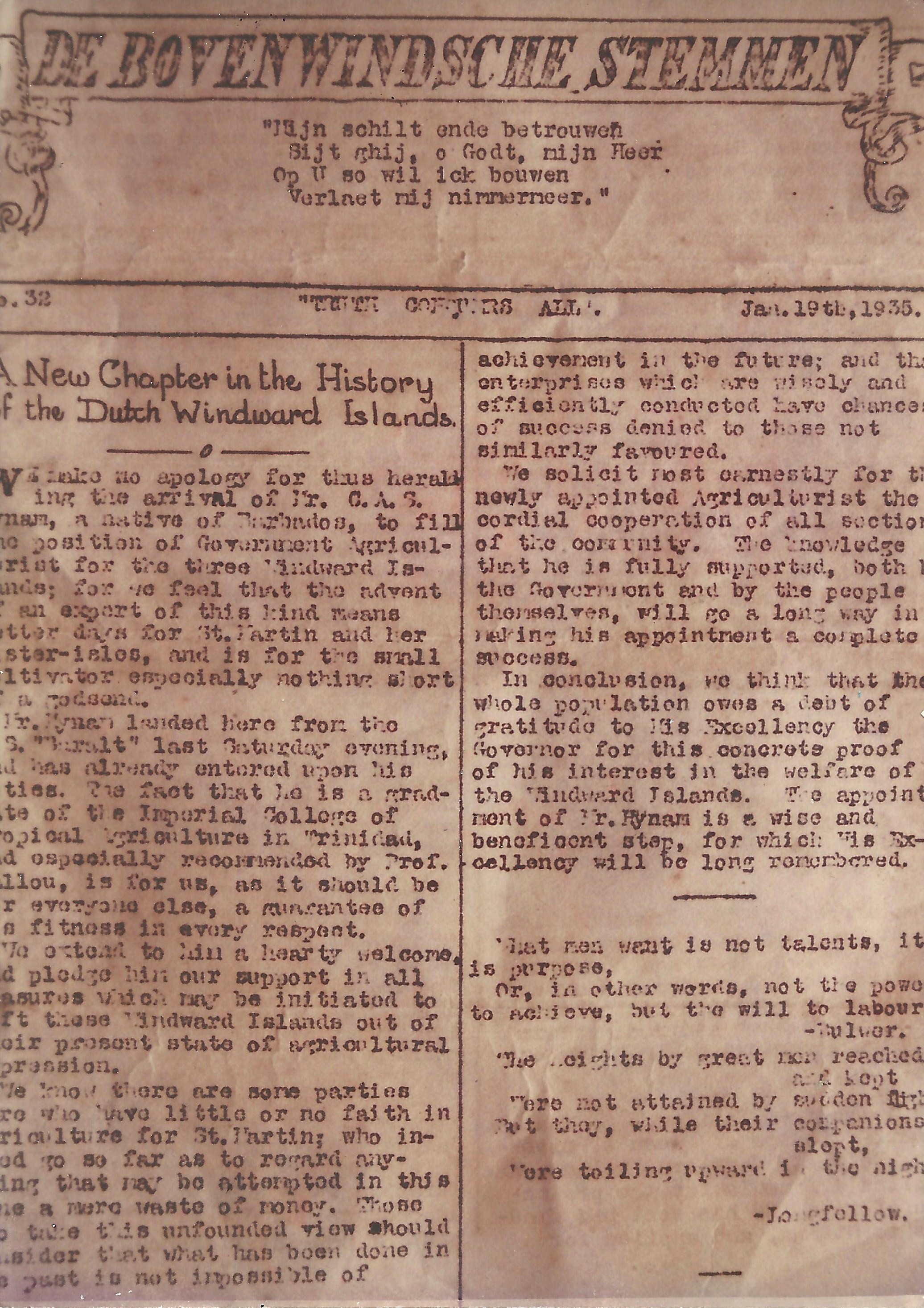On December 22nd, 1934 the newspaper “De Slag-om-Slag” saw the light of day at the home of the Editor on Frontstreet No. 61, Philipsburg, St. Martin. This newspaper was started by Anthony Reynier Waters Gravenhorst Brouwer who was born on Saba on Wednesday October 19th, 1892. The other newspaper at the time was “De Bovenwindse Stemmen” of which the Editor was Wilhelm Frederick Carel Ludwig August Netherwood who was born on St. Barths in 1870. I guess with those long names the newspaper business must have served some purpose to them.