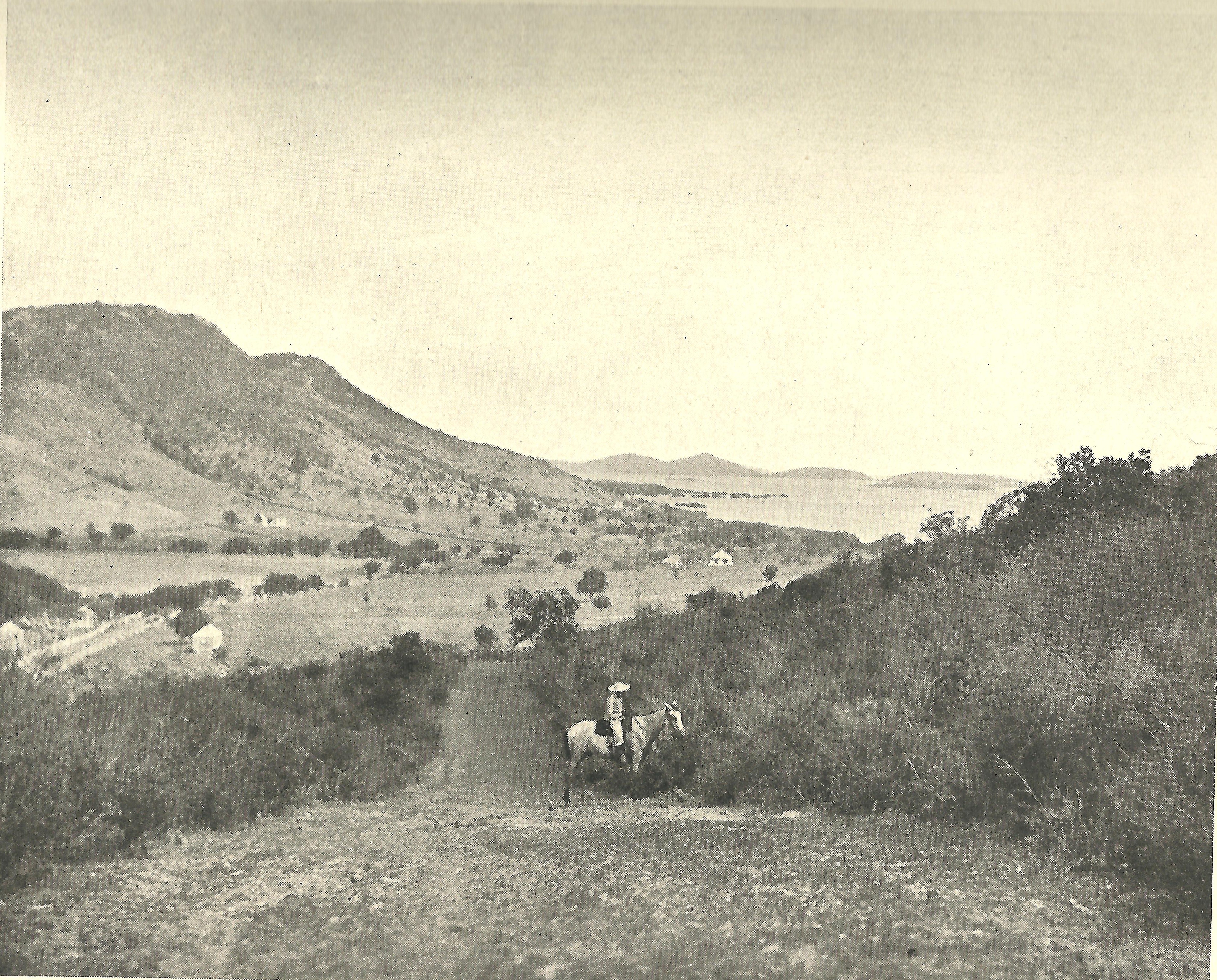 “In Marigot we took lodgings with a kind and courteous gentleman Mr. J.L.Hitzler, son of the author of the manuscript referred to already, and most kindly keeping us company the very same day when viewing estate “The Paradise”. Leaving Marigot on the north end we crossed a rather long stone bridge and came upon the estate of Mr. Verveer (the occasional head of the Dutch part), situated to the right. Then we continued riding up a mountain from where we looked into “Friars-Bay” and Anguilla on the left. We turned to the right on the way to Colombier when we were caught in a heavy shower of rain, forcing us to take shelter under a tall tamarind-tree near to the estate of Colonel Gumbes, living in Anguilla. Scarcely had we dismounted when two English ladies came sharing our hide-out and we continued our trip together as soon as the rain let up.