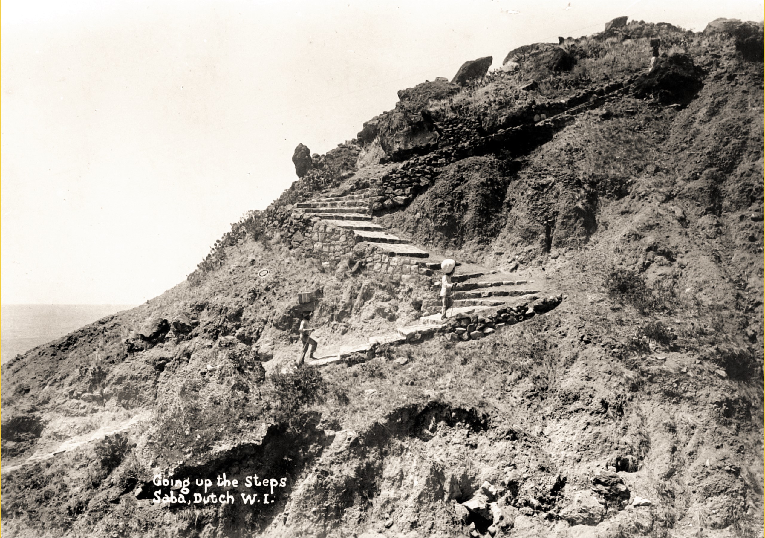 Sighing I looked up against the steep landing place, and wished from the depth of my heart, that we could already be on the top. If before this time.I was of the opinion that the landing on St. Eustatius was difficult, there is no comparison to be made with the landing at this island. There is no Bay, and the small flat embankment, at the foot of the steep mountain consists of some “vlenten” , or rather round washed up balls and rolling stones, on which there was a high surf present. And after this dangerous landing, the most difficult part of the voyage first begins. With every right the mountain path bears the name of The Ladder because along an irregular formed path of steps, one has to climb to the top. nearly 1700 feet to “The Bottom”, ( Icannot understand. because one must actually, with every effort of force climb for a whole hour before one has actually reached The Bottom). Added to that the late afternoon sun, shined so terrible, and I do not need to say this, that in the sweat of our faces we reached the object of our trip.