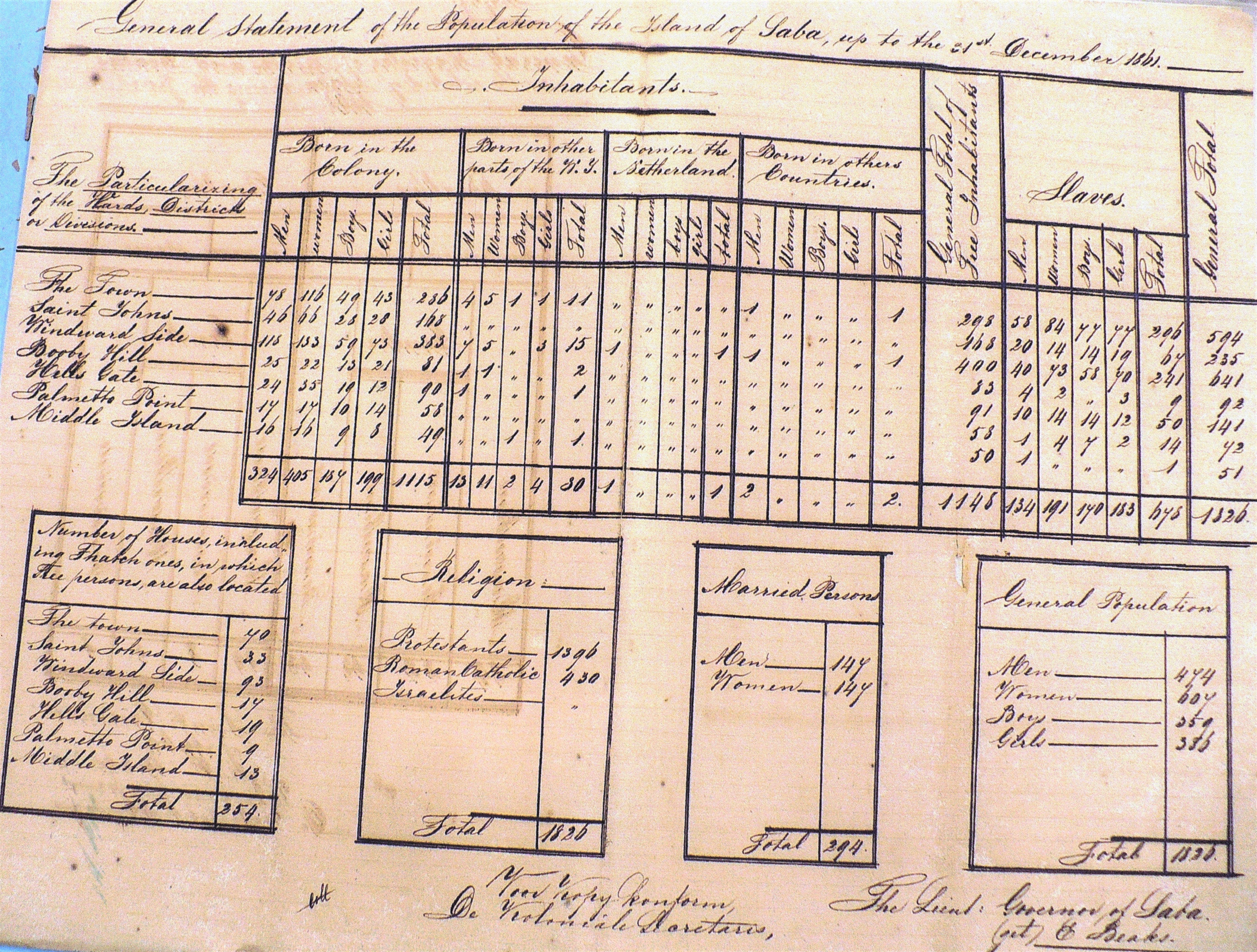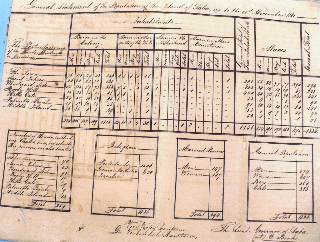 The language used here is a dialect English, and not one resident understand a word of Dutch. Although in general poor, the inhabitants of Saba live among each other very peaceful and harmonius, for which is proof when the take over of the island in 1816, not one case was brought before the Judge. For such much is contributed by the common marriages, whereby nearly the entire white population are related to one another. The natives are so attached to their place of birth, that when they go else where even if it settling on one of the neighbouring islands, they die from homesickness. The emigration to St. Eustatius has been done succesfully sometimes by some with good results