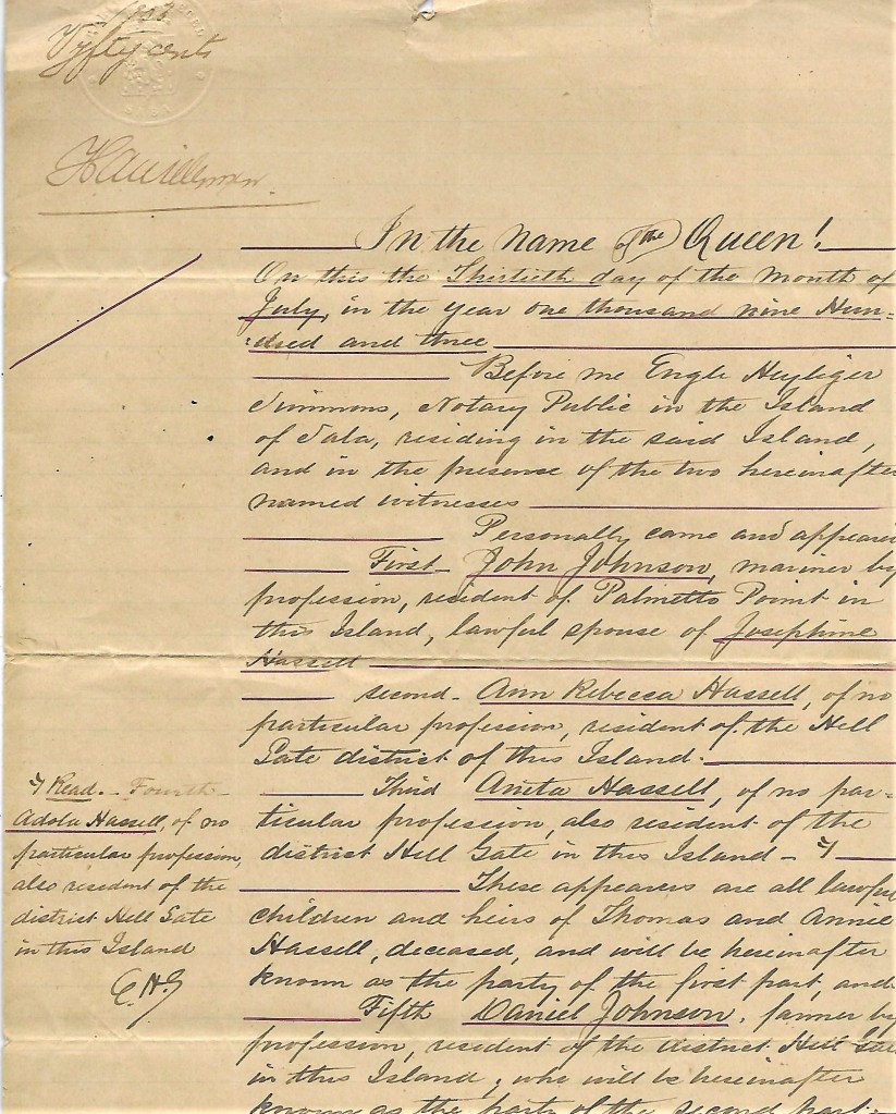 Another document #116 of 13/7/1869 states the following; “Mr. James Horton sold to Mr. John Johnson one sixth (1/6th) of the “Goat Cliff’) from the Well to “Smokey Gut”. witnesses Henry Hassell and Peter J. Hassell.