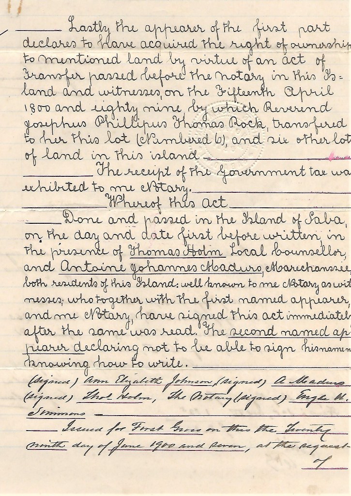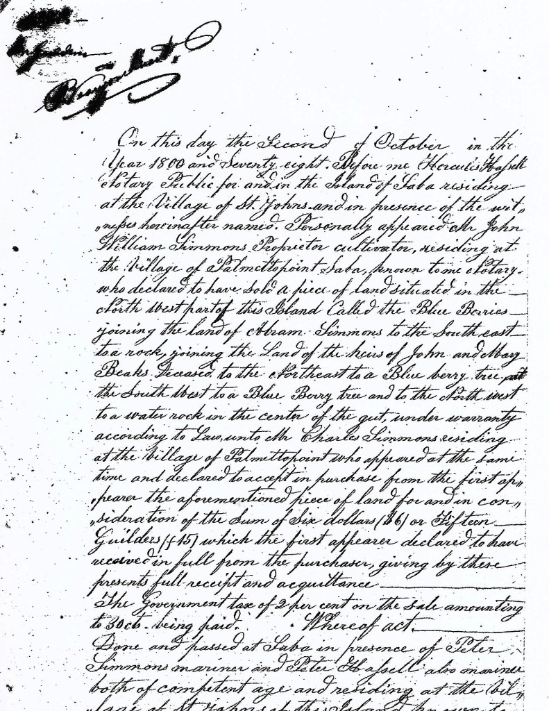 This bill-of-sale not only shows that Saba had a government but one that functioned, Even though the original settlers may have been pirates the Island of Saba was ruled according to International Standars of Law at the time. Saba had its own elected officials to assit the Commander of the Island,all native to the island. Saba had its own Court of Law which was comprised of all native Sabans, its own local Judge, its own local Notary while there was an appeals Court on St. Eustatius. In 2021 Saba is dependent on lawyers not from here as their advisors and seem to hestitate to ask locals for advice. Saba is now dependent on consultants not from here who do not know one cent worth of our local history and or would be historians who do not believe in oral history nor did they know the people and the hardship they went through to survive on this our beloved Saba.
