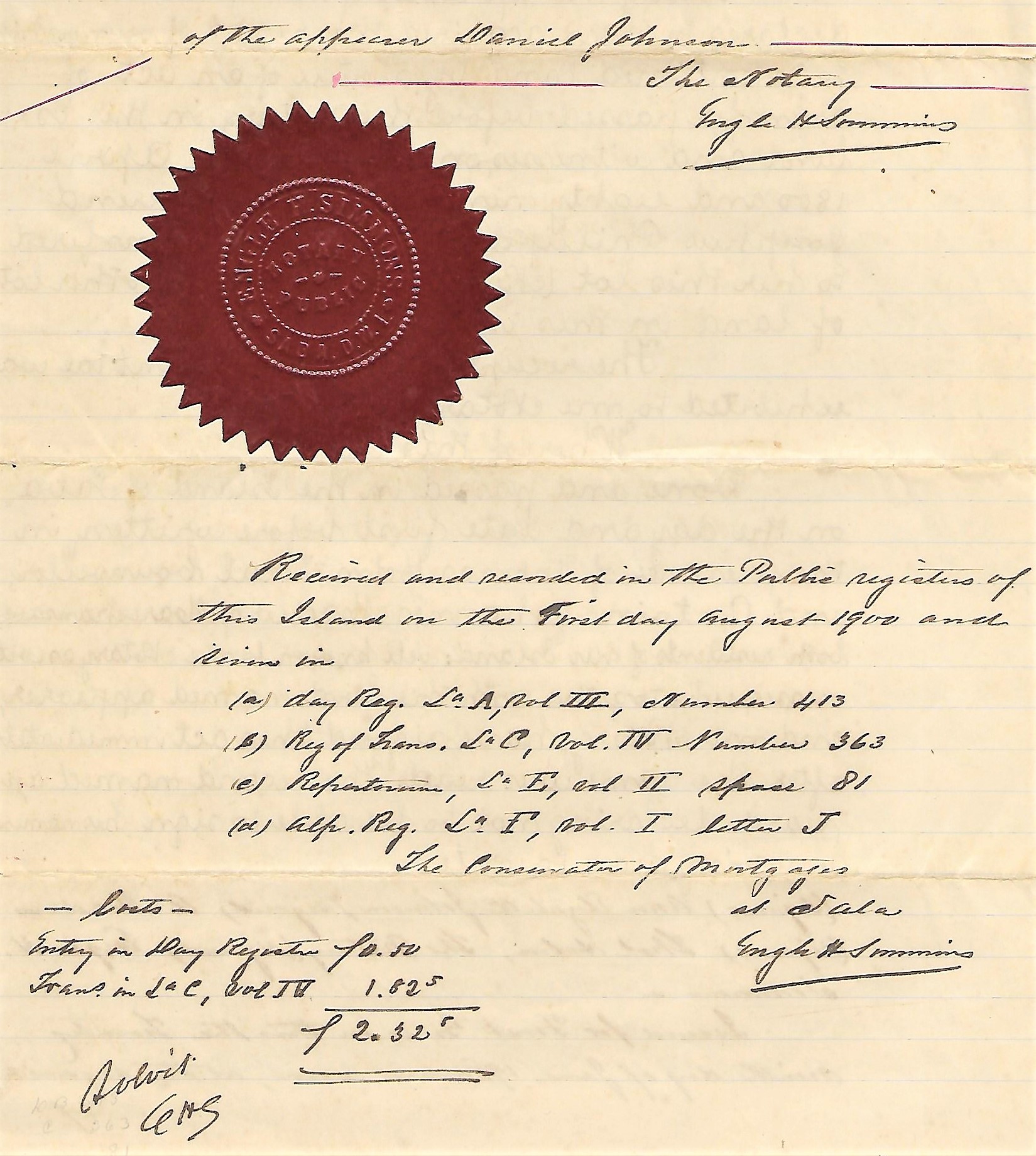 At a Vendue sale of May 25th 1869 the following is recorded: “Received of Mr. Thomas Beale the sum of $88.1 (Spanish Dollars) in full for the sixth part of the Goat Cliff frm the High Hill to the Red Cliff at “All too Far”. Signed John M. Dinzey Saba April 28th, 1805. Vendue Master. Exhibited and reorded this 6th day of August A.D. 1869. The Notary Public,Hercules Hassell.