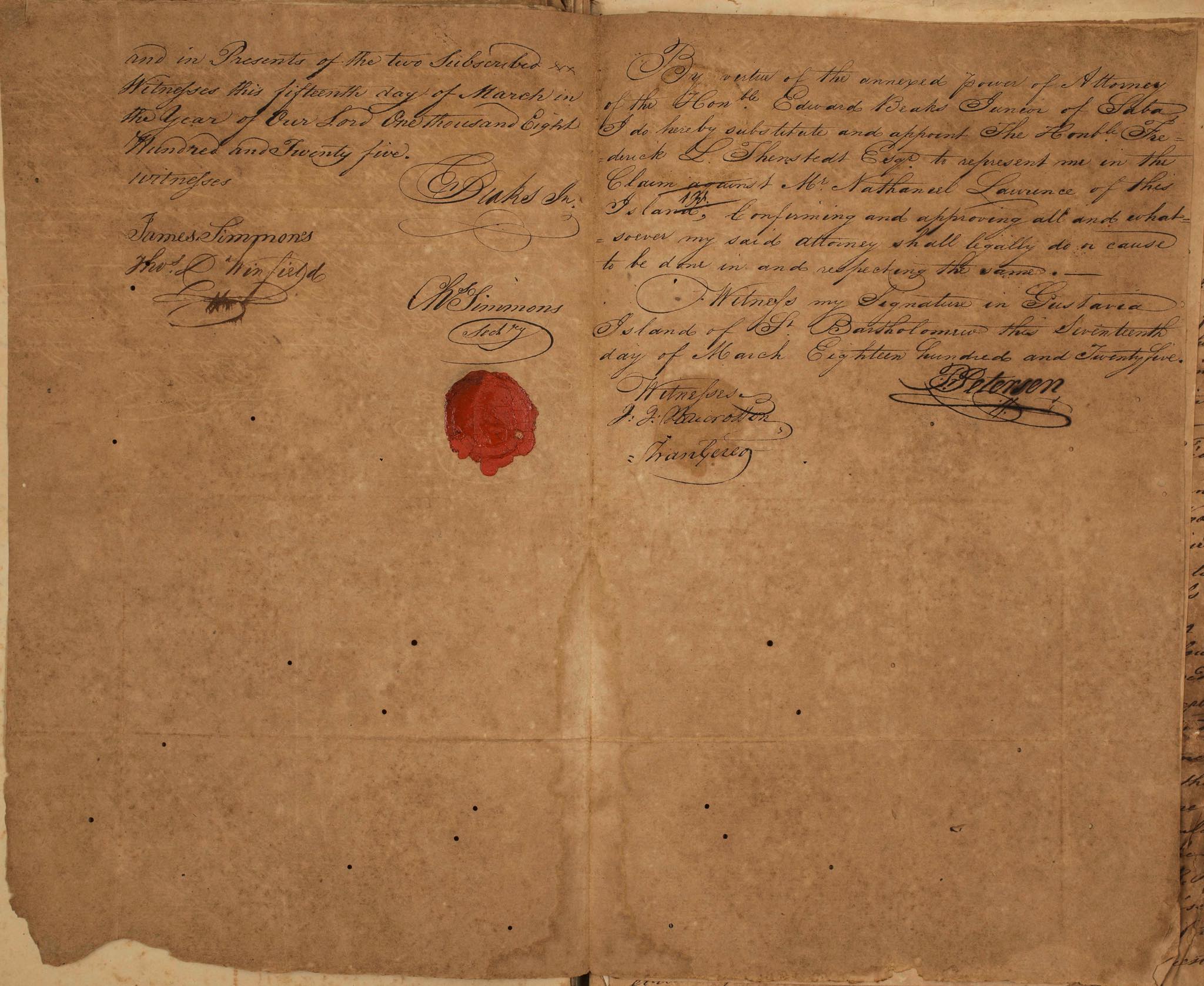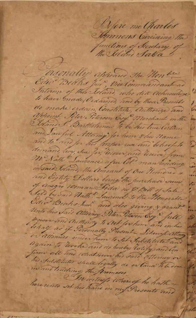 Personally appeared the Honourable Edward Beaks Junior, Vice Commandant ad Interim of this Island who did acknowledge to have made, ordained, and by these presents do make, ordain, constitute, authorize and appoint Peter Petersen, Esq. merchant on the Island of St. Bartholemew to be his true, certain and Lawful Attorney for him and in his name and to and for his proper use and behalf to demand, levy sue for, recover and receive from Mr. Nathaniel Lawrence a free coloured man residing on said Island, the amount of one hundred and eighty dollars being the purchase sum of a Negro woman Fida as per bill of sale sold by said Nathaniel Lawrence to the Hon. Edward Beaks Junior and also giving and granting unto his said attorney Peter Petersen, Esq. full power and authority to act for him and in his behalf as if personally present – likewise attorney or attorneys under him to sit, substitute and regain to revoke and do hereby ratify and confirm all and whatsoever his said attorney or his substitute shall legally do or cause to be done in and touching the promise.